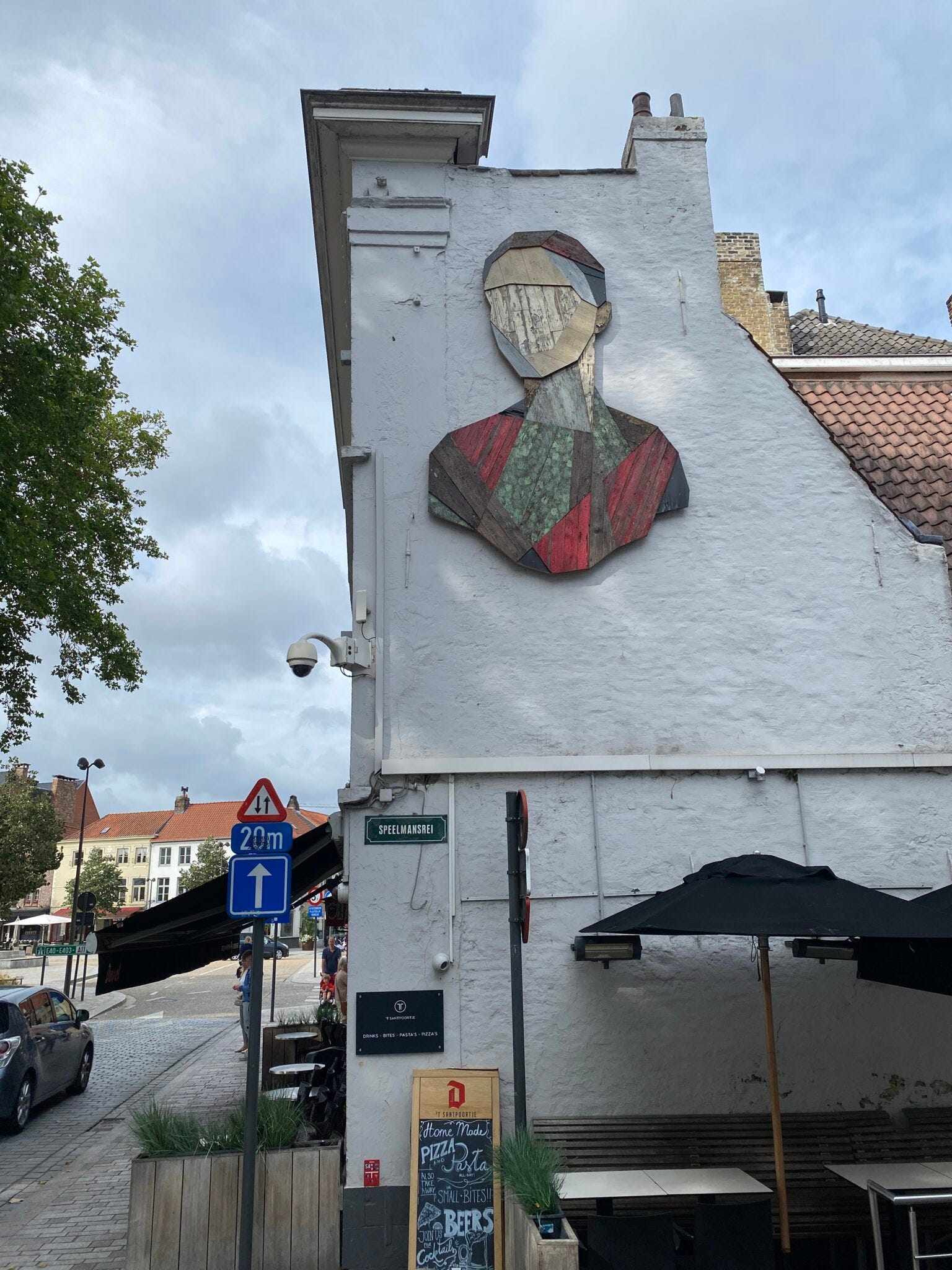 Durch Zufall lernt Michael den in Brügge namenhaften Künstler Stefaan De Croock „Strook“ kennen. Aus alten, verwitterten Materialien, die etwa bei Renovierungsarbeiten anfallen, etwa Türen, Böden, Möbeln, fertigt er moderne Kunstwerke. Bekannt ist er vor allem für seine Portraits aus Holz. Eines seiner Werke findet man auch auf dem ‚t Zand, einem großen Marktplatz in der Nähe des Bahnhofs. Dort findet übrigens auch jeden Samstag ein typischer Markt statt, wie man ihn eben so kennt – nur eben ’nen Ticken (oder zwei) schöner, wir sind schließlich in Brügge.