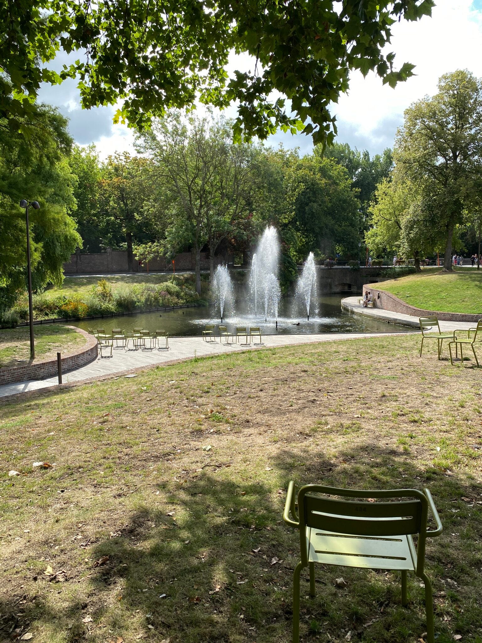 Nahe des Dijver liegt der Königin-Astrid-Park – malerisch und perfekt für ein Picknick. In der Mitte ein hübscher Teich, große, schattenspendende Bäume, ein Pavillon und überall im Park stehen Stühle herum. Die kann man sich einfach schnappen und an einen Ort seiner Wahl stellen, um dort die Seele baumeln zu lassen, was zu snacken, ein Pläuschlein zu halten oder wonach einem eben sonst so der Sinn steht. Allein schon erstaunlich, dass diese Stühle nicht auf mysteriöse Weise verschwinden, sondern tatsächlich alle da bleiben – toll! Michael und Jochen finden, solche kleinen, liebevollen Details sagen einfach immer etwas über eine Stadt aus. Man macht sich Gedanken. Das sind eben nicht nur Stühle!