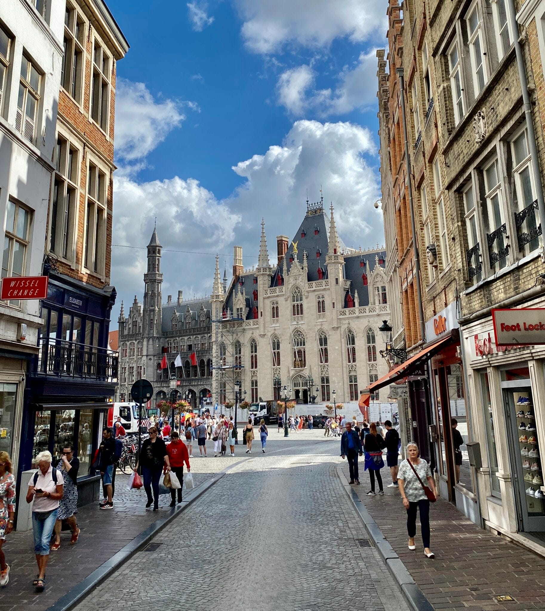 Micha lies sich weiter treiben – in Richtung Grote Markt. Dort steht auch der Belfried, ein knapp über 80 Meter hoher Glockenturm aus dem 13. Jahrhundert. Das ist mal ’ne Zahl. Der Blick von oben über die Stadt: „Atemberaubend“, schwärmt Michael. Der Grote Markt ist, wie es sich für den Namen gehört, mit seinen bunten Häuschen nicht nur überaus schön anzusehen, sondern auch eine Art „Fressplatz“ (o-Ton Michael, charmant wie immer!). Fast jedes der kleinen Häuser beherbergt ein Restaurant oder Café.