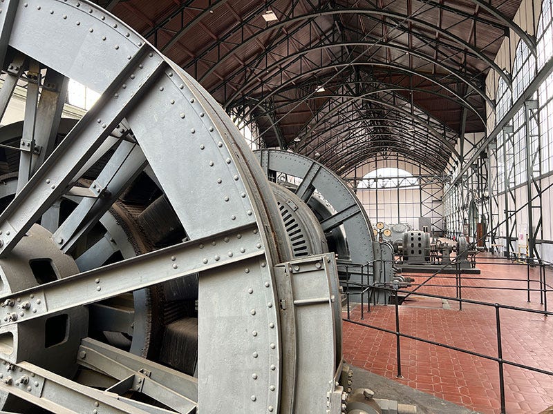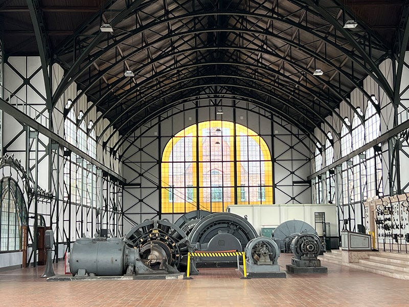 Jochen schiebt eine schwere Metalltür auf und steht in einer riesigen, lichtdurchfluteten Maschinenhalle – aus dem gekachelten Boden ragen riesige Maschinen und Zahnräder heraus, die Jochen überragen und noch vor wenigen Jahren aktiv waren. Besonders beeindruckend ist die riesengroße glänzende Schalttafel aus Messing und Marmor – ein Altar der Elektrotechnik. Ebenfalls beeindruckt ist Jochen vom ovalen Eingangsportal im schönsten Jugendstil, das ein Science-Fiction-Regisseur designt haben könnte. Jochens Restaurant-Tipp: der Pferdestall auf dem Gelände.