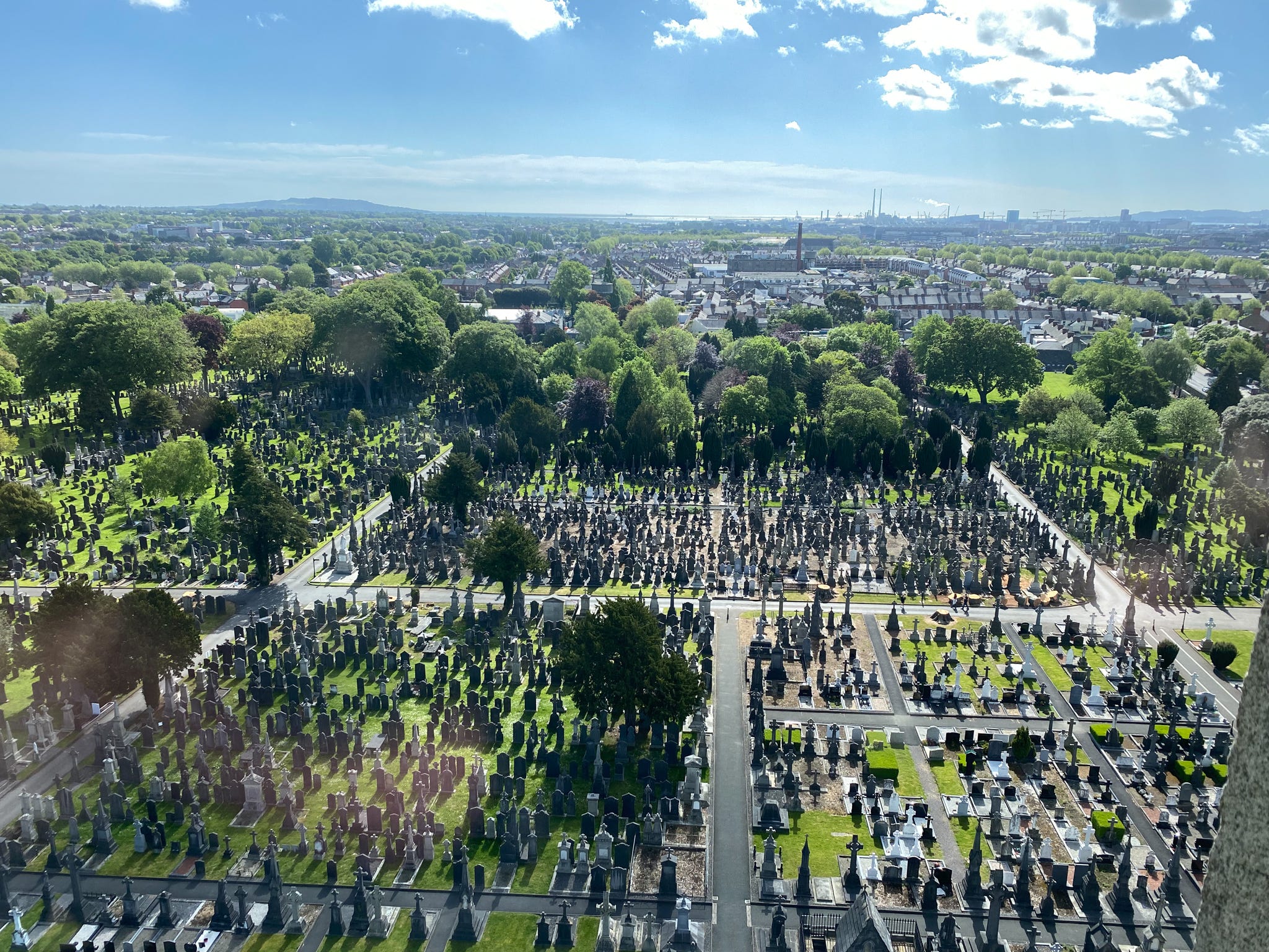 Mit einem Mann aus den USA ist Michael dann auch ins Gespräch gekommen: Weil er irische Wurzeln hat und selbigen auf den Grund gehen wollte, ist er nach Dublin gereist. So hat Michael vom Glasnevin Cemetery, dem größten Friedhof Dublins, erfahren. Der Friedhof wurde 1832 von Daniel O’Connell gegründet – mit dem Ziel, dass dort auch katholische Menschen begraben werden dürfen. Der Grabstein von Daniel O’Connell ist „etwas“ größer als alle anderen. Genauer gesagt ist es ein 30 Meter hoher Turm. Den kann man auch erklimmen. Das hat Michael sich natürlich nicht nehmen lassen. Oben wartet ein unfassbarer Ausblick. So hat sich spontan also auch ein Friedhof in Michaels Dublin-Highlights eingereiht.