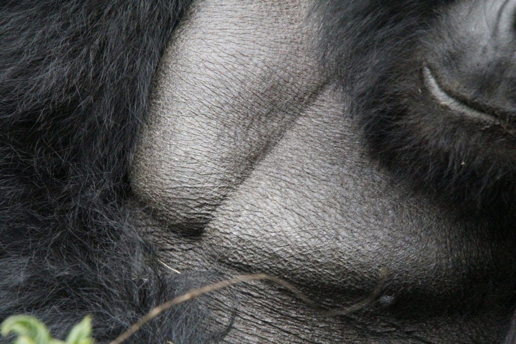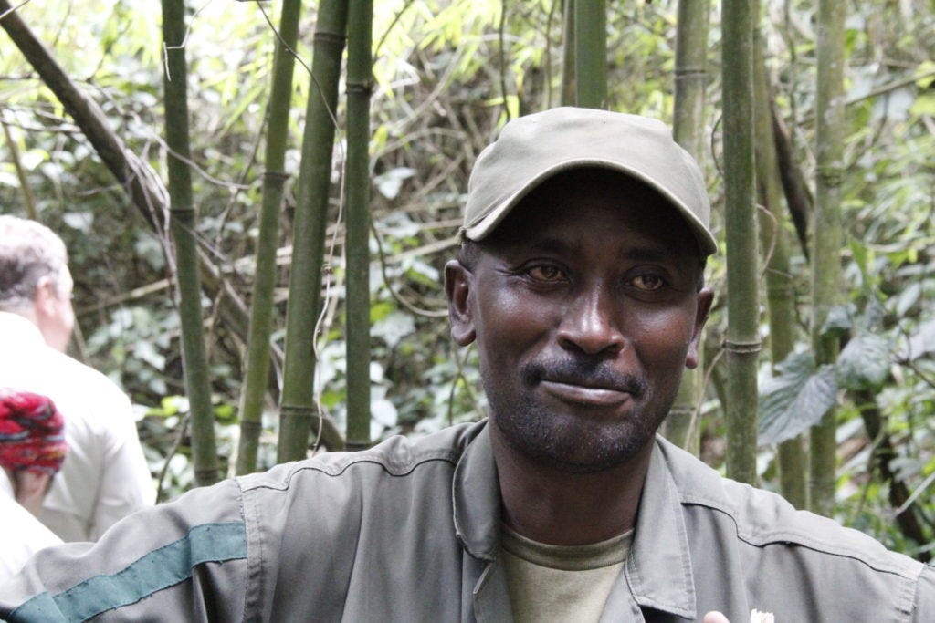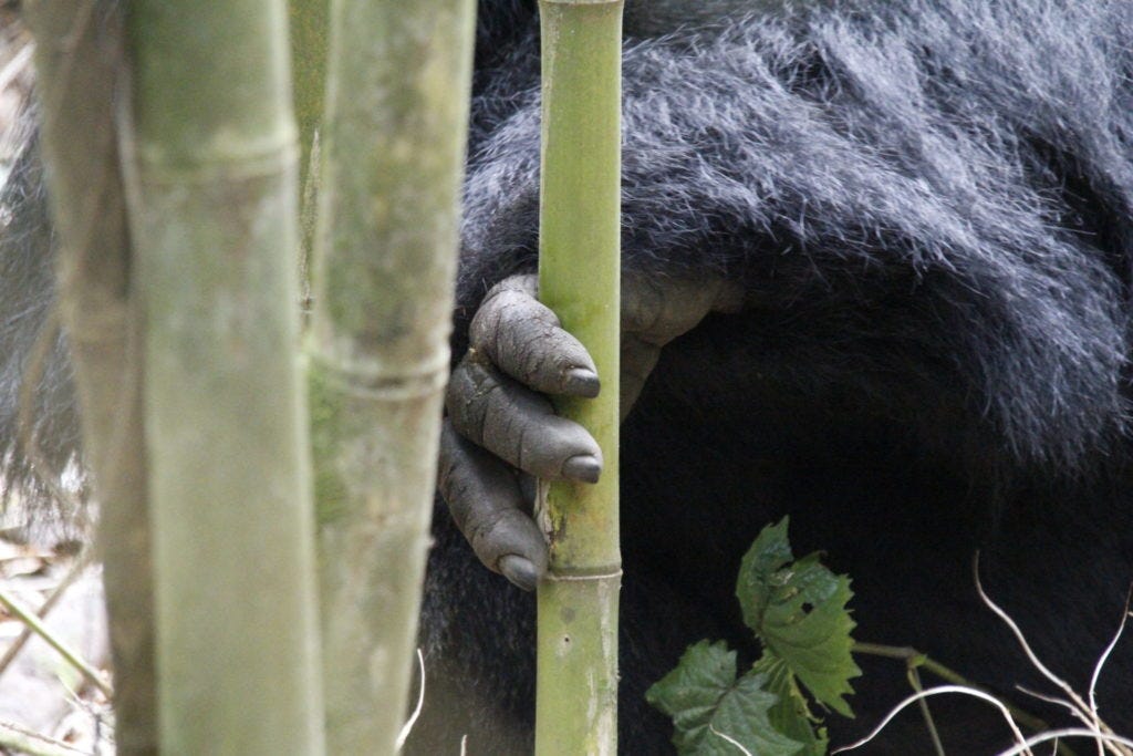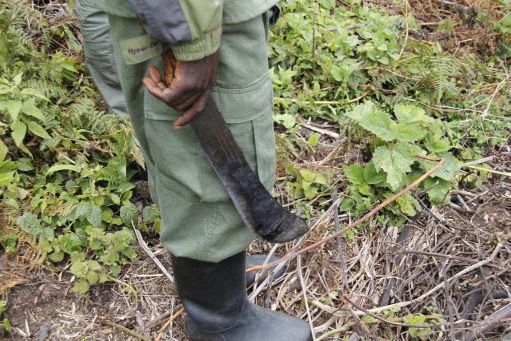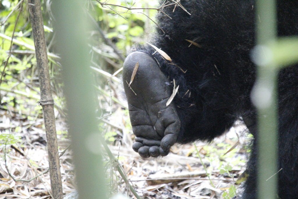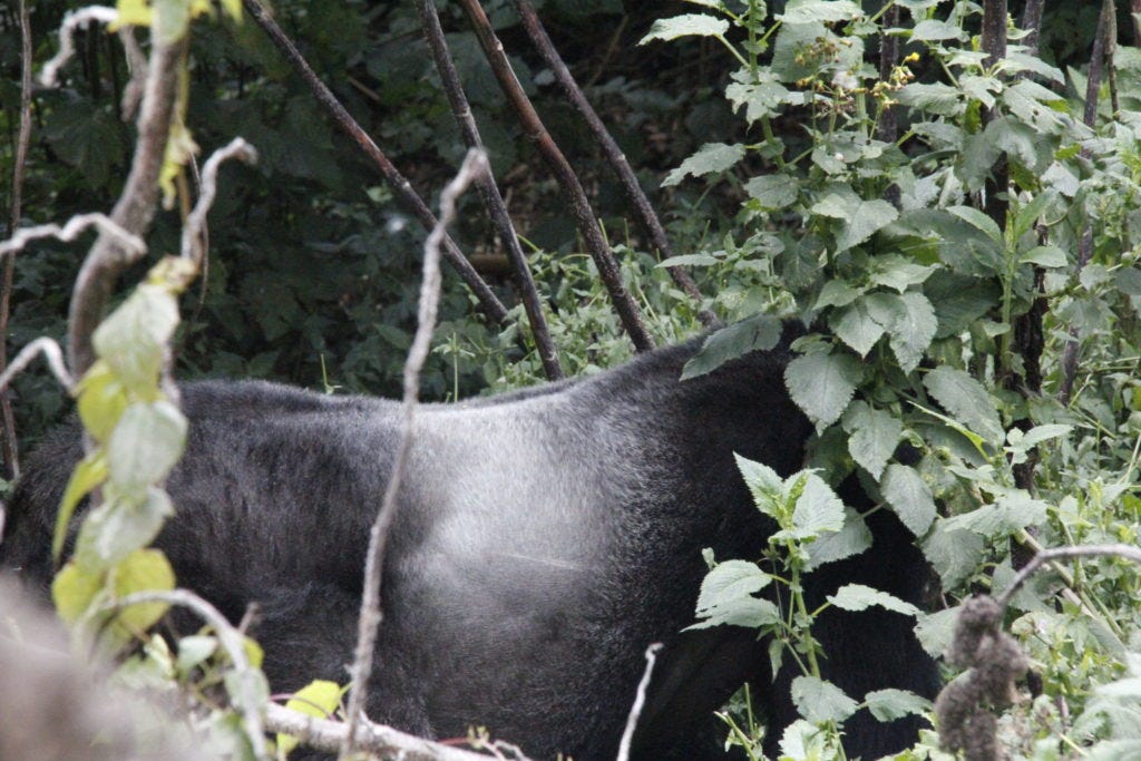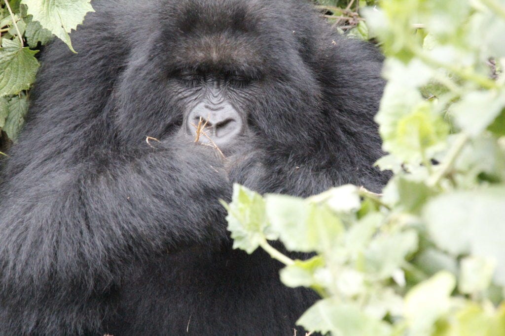 Vorab kann man nie ganz sicher wissen, wie lange die Wanderung dauern und ob man überhaupt Gorillas begegnen wird. Das ist Natur. Jochen und der Rest der Gruppe hatten Glück. Nach nur drei bis vier Stunden – mit Machete querfeldein durch’s Unterholz – wies der Tourguide die Gruppe an: Jetzt ganz leise sein.
