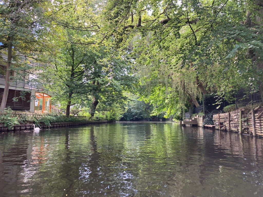 Ratschlag am Rande, nachdem Jochen mit einer komplett nassen Hose mit der U-Bahn zurückfahren musste: vielleicht was zum Wechseln mitnehmen. Vor allem dann, wenn man anschließend noch einen Spaziergang durch Eppendorf, Winterhude und/oder Rotherbaum machen will – fast unerträglich schöne Gegenden mit ganz viel Eigendynamik. Kleine Cafés und Lädchen, große, weiße Altbauten, Grünflächen und natürlich wieder: Wasser. Auch abseits des großen Hafens und des Stadtzentrums kann Hamburg sich sowas von sehen lassen.