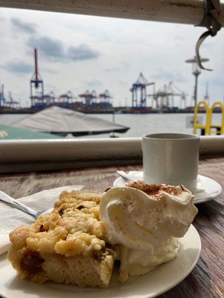 Jochen ist noch weiter bis nach Övelgönne gefahren, wo ein wunderschöner Elbstrand zum Sonnetanken einlädt. Im Kleinhuis’ Restaurantschiff im Museumshafen hat Jochen – als Hobby-Kuchensommelier und Quasi-Professor für die vierte Mahlzeit des Tages – einen der besten Rhabarber-Streusel seines Lebens gegessen. Und natürlich gibts auch hier wieder besten Fisch. Wer Lust hat, kann dann noch ein bisschen Häuser und Villen gucken – die sind hier nämlich, wie vielerorts in Hamburg, einfach richtig schön.