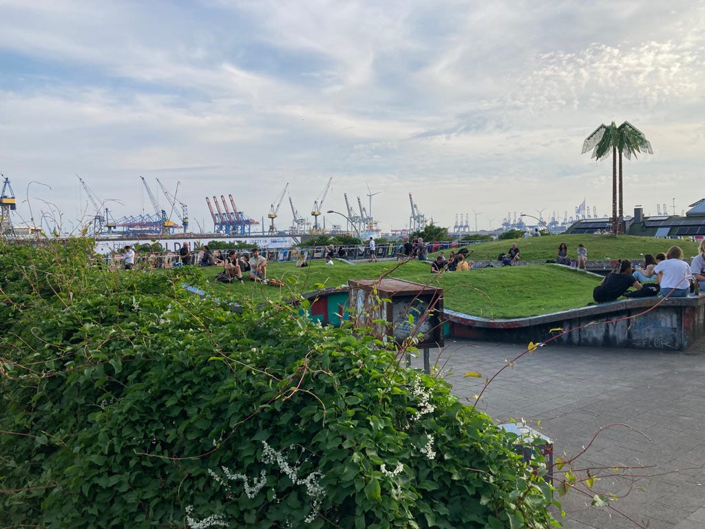 Weiter gings dann zum Elbufer, an den Landungsbrücken entlang – ein Ort, an dem immer was los ist. Auf dem Weg zum nächsten Stop empfiehlt Jochen die Brücke 10 für eine kleine Stärkung – Fischbrötchen! – zwischendurch. Und von dort aus ist man dann in Nullkommanix im Park Fiction in St. Pauli – ein Ort der Subkultur, die in keiner anderen Stadt so omnipräsent und sichtbar ist wie in Hamburg, findet Jochen. Kreativ, wach, aktuell, jung. Hier findet Leben statt. Einfach treiben und inspirieren lassen. Auch die Entstehungsgeschichte ist spannend: Der Park Fiction wurzelt in einer Bürgerinitiative, die „die Bebauung der letzten Freifläche m Hafenrand verhindern“ wollte. Anwohner*innen, Künstler*innen und Politiker*innen arbeiteten gemeinsam über Jahre hinweg an der Planung und Realisierung. 2006 wurde der ParK Fiction dann offiziell eröffnet. Seitdem ist er ein Paradebeispiel dafür, dass – nicht nur in Sachen Stadtentwicklung – Besonderes entstehen kann, wenn Menschen sich gemeinsam für etwas einsetzen.