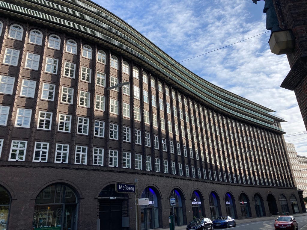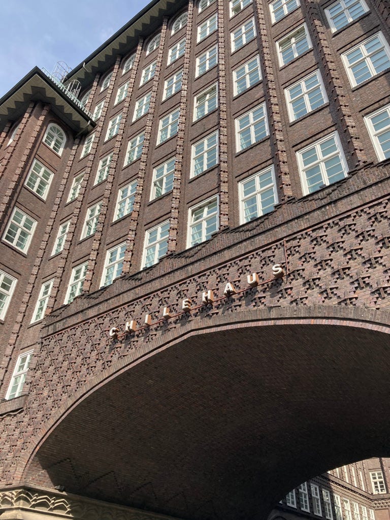 Jochen hatte einen ungefähren Plan. Zuerst ging es zum Chilehaus nahe der Speicherstadt. Als Symbol wirtschaftlichen Aufschwungs wurde die „Ikone des [Backstein-]Expressionismus“ 1924 fertiggestellt. Speicherstadt und Kontorhausviertel mit Chilehaus sind seit 2015 UNESCO-Weltkulturerbe. Für Jochen repräsentiert das Chilehaus gewissermaßen Hamburg an sich: „Bodenständig und doch pompös.“