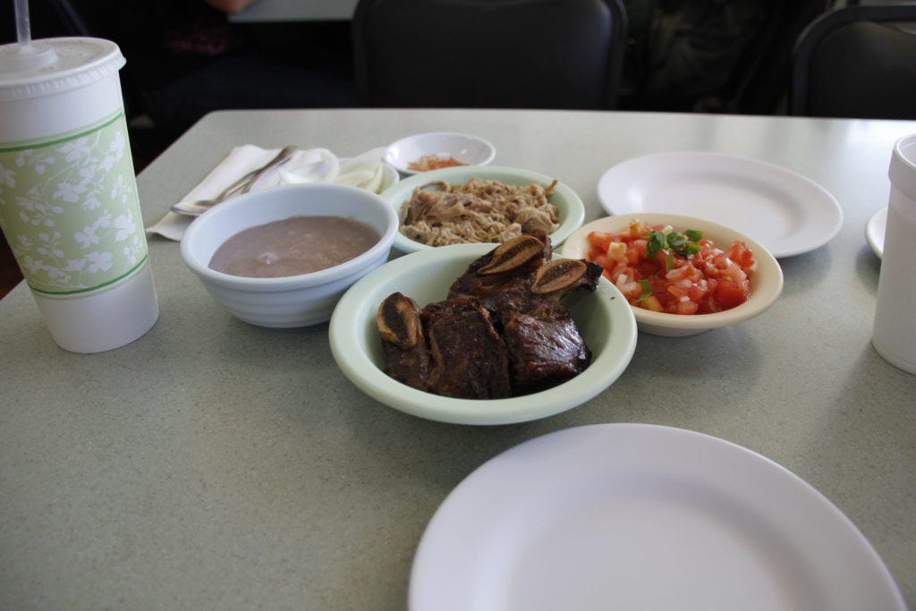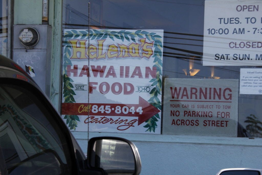 Typisch hawaiianisch bzw. polynesisch ist zum Beispiel „Poi“ – hergestellt aus Tarowurzeln. Jochen beschreibt Poi als „violetten Brei“, „kleisterartige Masse“. Das kann man jetzt mal so stehen lassen und sich darauf einstellen, dass Poi sicherlich besser schmeckt als Jochens‘ Artikulation es vermuten lässt. Immerhin ist das Gericht seit langer Zeit eines der wichtigsten polynesischen Grundnahrungsmittel! Kalua-Pig ist, so Jochen, quasi Pulled Pork Hawaii-Style. Außerdem bestens schmecken lassen hat er sich raffiniert marinierte Luau-Rippchen und Lomi Salmon, also Lachs-Tomaten-Salat. Das alles gabs im Helena’s Hawaiian Food – ein kleines, fast unscheinbares Diner an einer Hauptstraße, doch ganz offenbar einen Besuch wert.