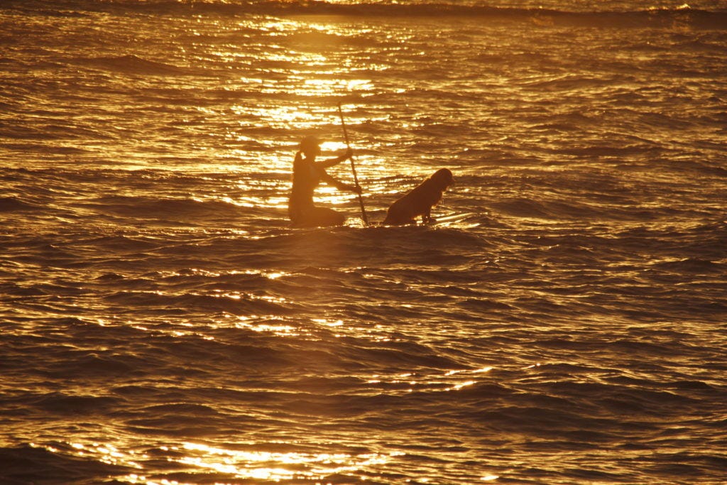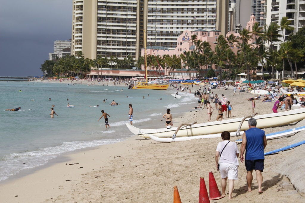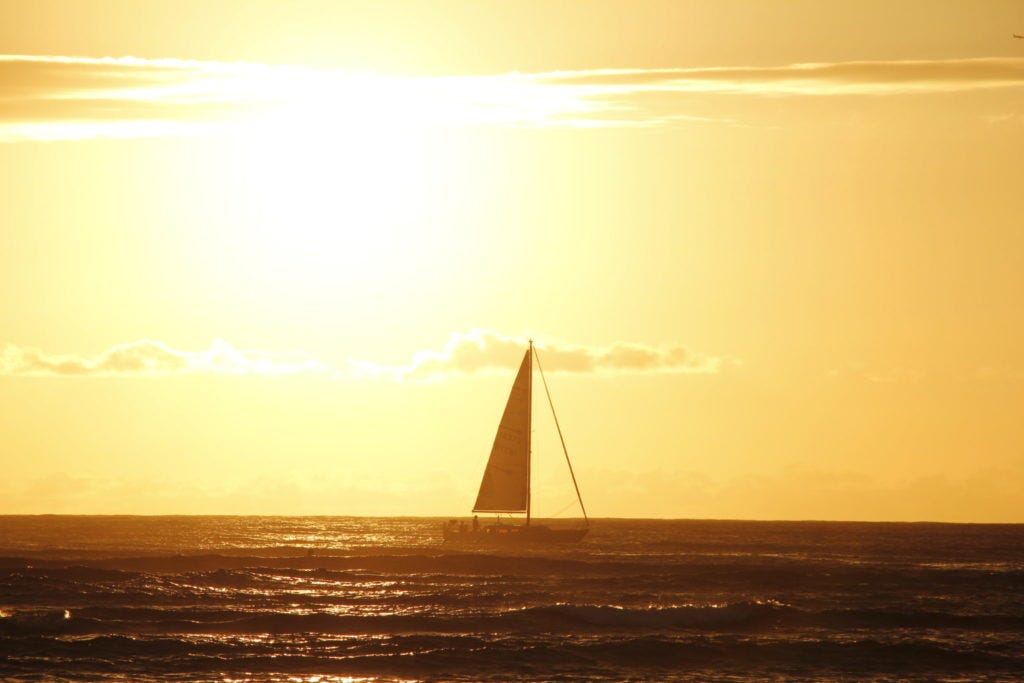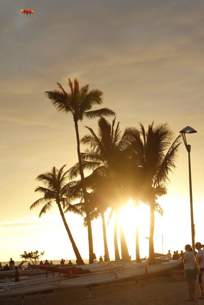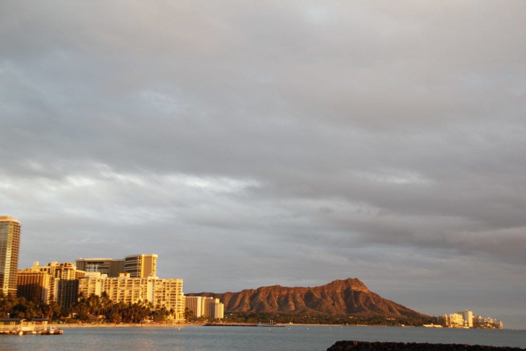 Angekommen ist Jochen auf Oʻahu. Die Hauptstadt von Oʻahu kennt vermutlich jede*r: Honululu. Übersetzt heißt das übrigens so viel wie: geschützte Bucht. Und ein Stadtteil von Honolulu weckt natürlich mindestens genauso zuverlässig Fernweh-erregende Hawaii-Asoziationen: Waikiki – und der Waikiki Beach. Genau dort saß Jochen am ersten Abend, ein buntes Shave Ice in der Hand, den Diamond-Head-Vulkan hinter der Skyline bewundernd, in den goldenen Sonnenuntergang aufs Wasser blickend, auf dem eine Frau mit Hund auf dem Surfboard „Gassi paddelt“. Man könnte sagen: ein gelungener Einstieg.