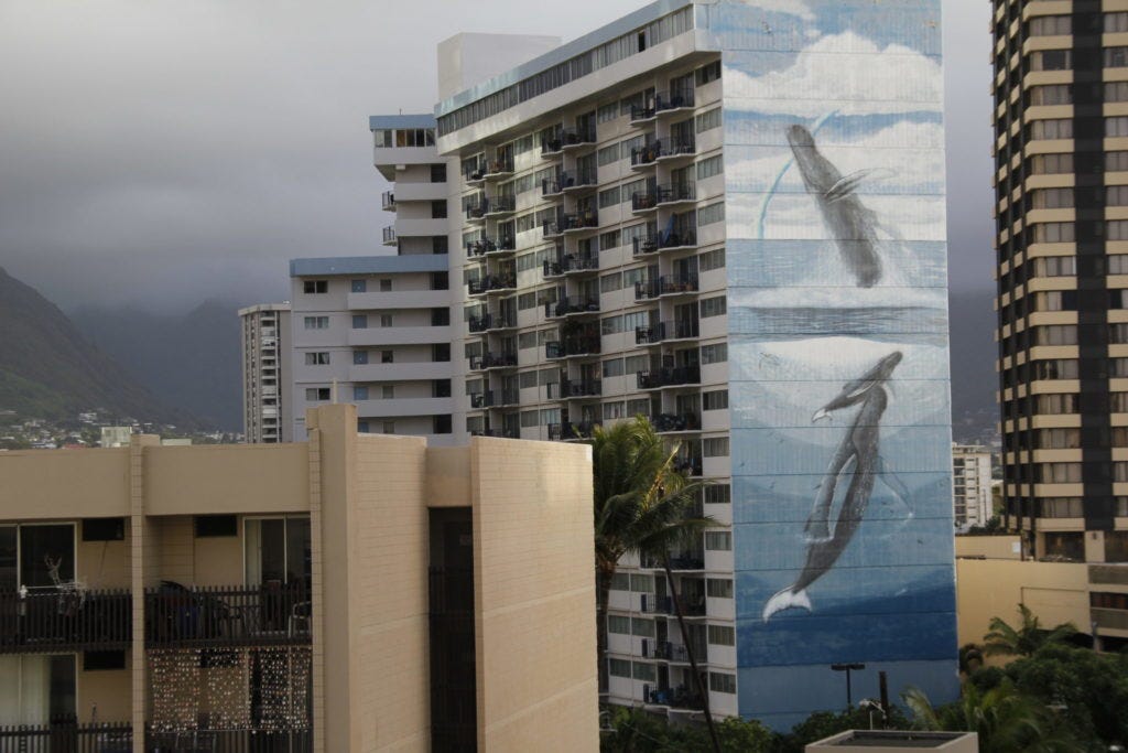 Natürlich hat Oʻahu viel wundervollste Natur zu bieten. Was darüber hinaus vielleicht gar nicht unbedingt jede*r auf dem Schirm hat: Honolulu ist eine Großstadt und sehr urban! Nur eben auf eine irgendwie andere Art und Weise… Was Jochen unter anderem in dem Moment ganz bewusst festgestellt hat, als sein Blick auf einen Wolkenkratzer fiel, auf dessen Fassade keine bunt blinkende Werbung prangte, sondern ein riesiges Wal-Gemälde. Und überhaupt scheint hier alles ein bisschen entspannter zu sein…„Shaka“ eben.