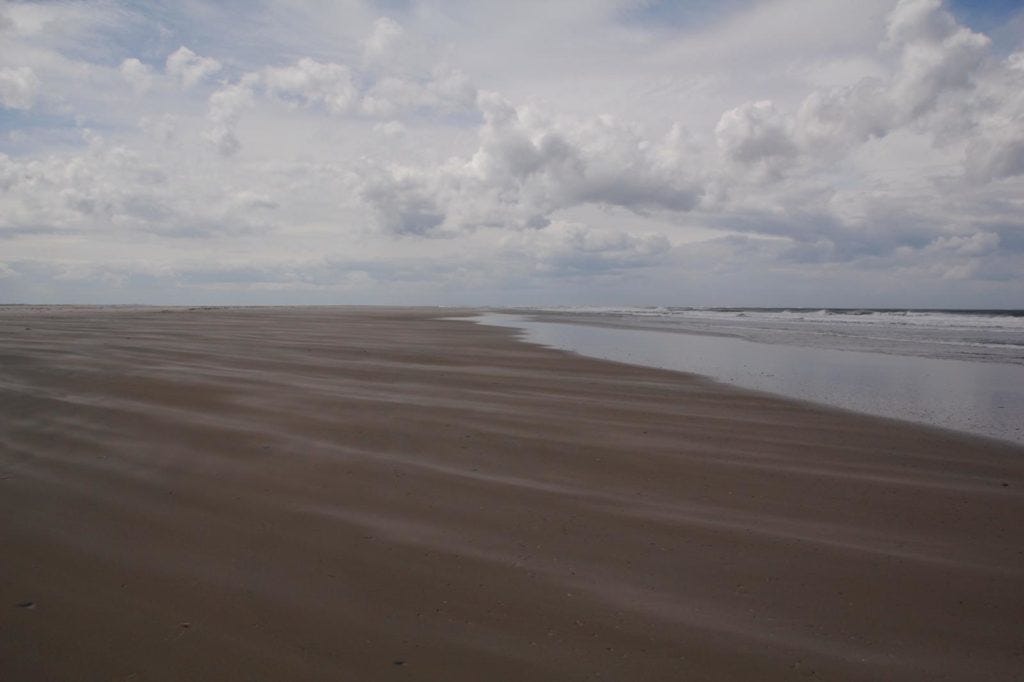 Nach einer windigen Radtour wurde Jochen belohnt mit einem Anblick, der fast schon surreal war. Durch ein paar schilfbewachsene Dünen hindurch eröffnet sich mit einem Mal die Definition von Weite. Weißer Sand in alle Richtungen. Riesige Flächen. Bodennebel aus Sandwehen, fast mystisch. Gigantische Wolkenbilder. In der Ferne Seehunde und das wild tanzende Meer mit Wellen, die ewig weit auslaufen und trotzdem nicht mal annähernd an einen selbst heranreichen. Entkoppelt von Zeit und Raum. Wandern über den Meeresboden in einer anderen Welt. Und abends im Bett der Gedanke: „Darum reise ich.”