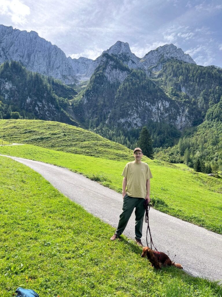 Oben öffnet sich eine Welt aus Almwiesen, Hütten und Stille. Vor einem erhebt sich der Zahme Kaiser, im Hintergrund sein berühmter Bruder, der Wilde Kaiser – zwei Namen, die halten, was sie versprechen. Hier ist die Luft klar, der Horizont weit, und irgendwo läuten Kuhglocken. Auf der Bank am Aussichtspunkt versteht man, warum man manchmal einfach „in die Berge muss“.