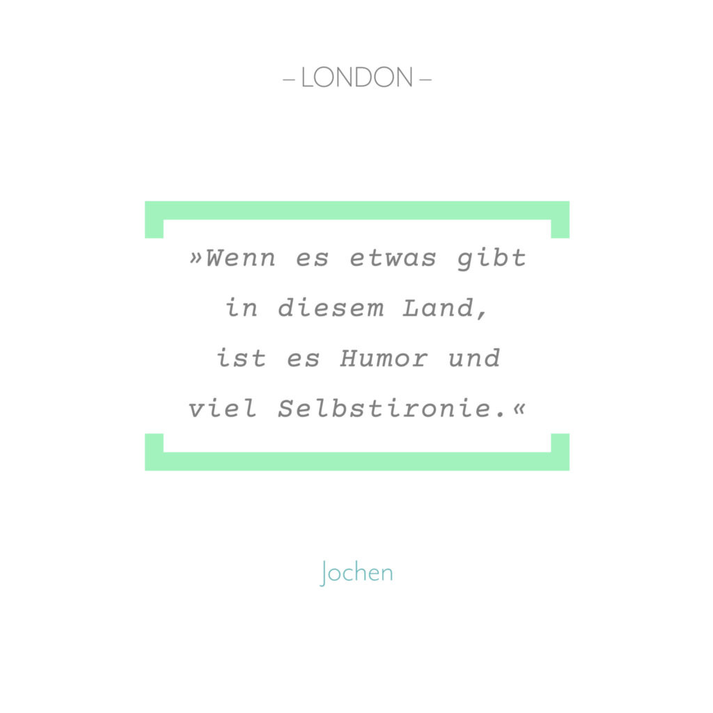 Ja, auch in London gibt es Gegensätze. Nicht alles ist fancy-schick oder fancy-hipp oder fancy-fancy. Trotzdem: Selbst wenn Jochen ungeschönt von Luton, einer der weniger angesagten Gegenden Londons spricht, kann (und will) man sich nicht dagegen wehren, noch immer Sympathie zu empfinden. Grund dafür: die freundliche, offene, hilfsbereite Art der Londoner, und ihr Humor – stets garniert mit einer Extraportion herrlichster Selbstironie. Also doch fancy. Anders fancy.
