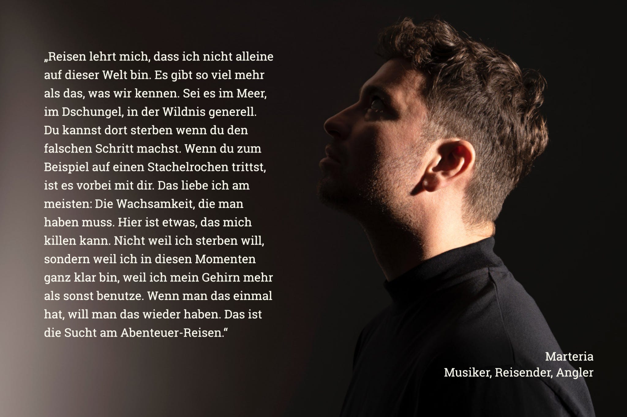 Das Reisen habe er im Blut, sagt er, wie alle in seiner Familie. In der DDR groß geworden, war Reisen lange alles andere als eine Selbstverständlichkeit. Umso intensiver lebt Marten seine Reiselust heute aus. Man könnte fast sagen: Marteria definiert das Wort „Abenteuerreisen“ neu. Die Geschichten, die er erzählt, lassen einen sprachlos zurück – was nicht weiter schlimm ist, denn wenn Marten von seinen Erlebnissen erzählt, will man nichts außer zuhören, staunen und mehr davon.