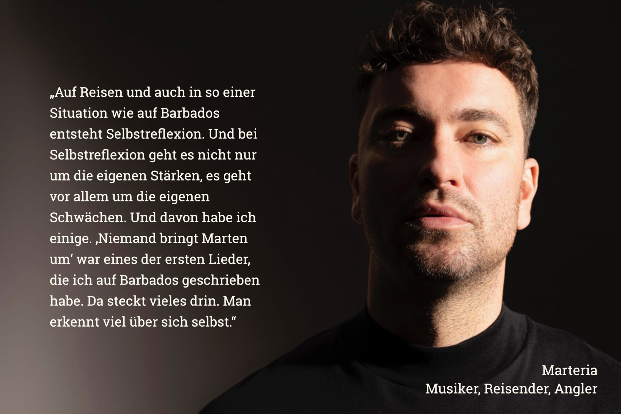 Auch der neue Marteria-Song „Niemand bringt Marten um“ ist gespickt mit Lines, die von Abenteuern aller Art erzählen – inklusive einer Menge Selbstreflektion. Die ist für Marten nicht nur grundsätzlich wichtig, sondern auch ein ganz essenzieller Teil authentischer Texte. Dabei geht es ihm vor allem auch um die Auseinandersetzung mit den eigenen Schwächen. Geschrieben hat er den Song auf Barbados – sein „Zufluchtsort“ als die Pandemie Fahrt aufnahm. Wozu die Anführungszeichen? Das lasst ihr Euch besser direkt von Marten erzählen: