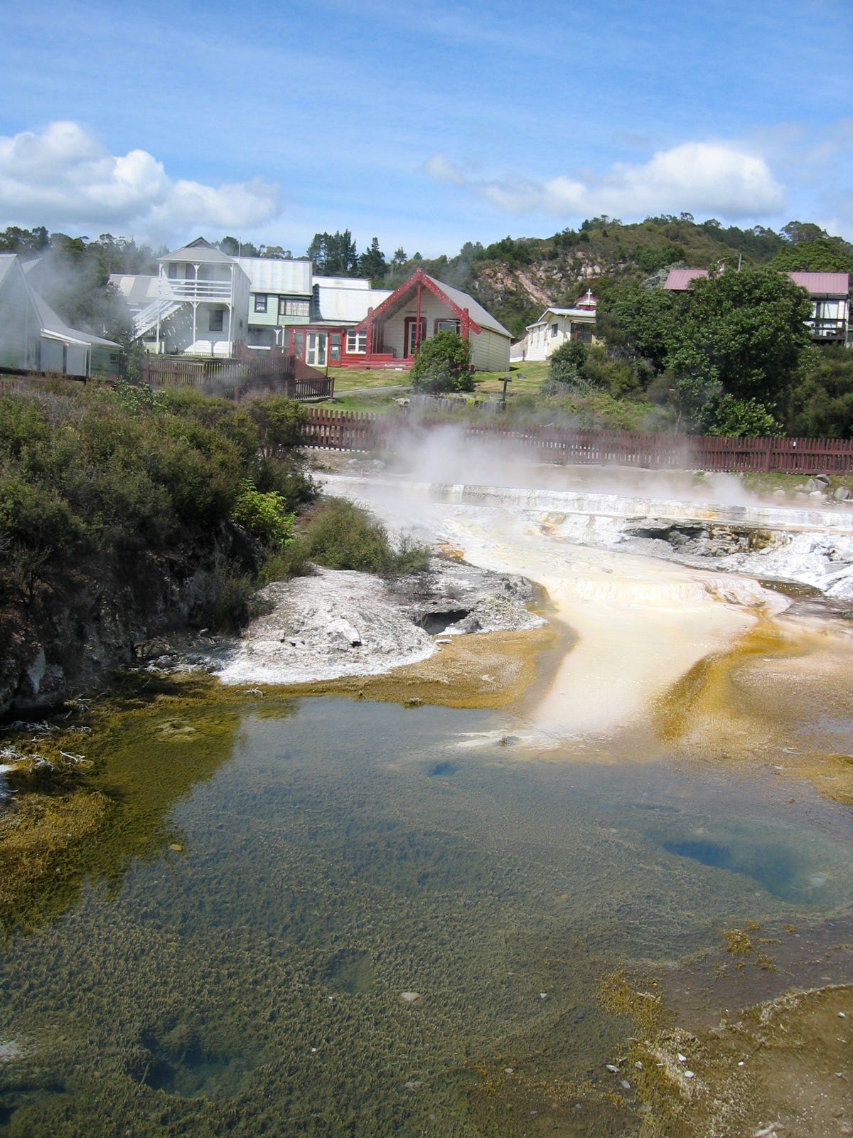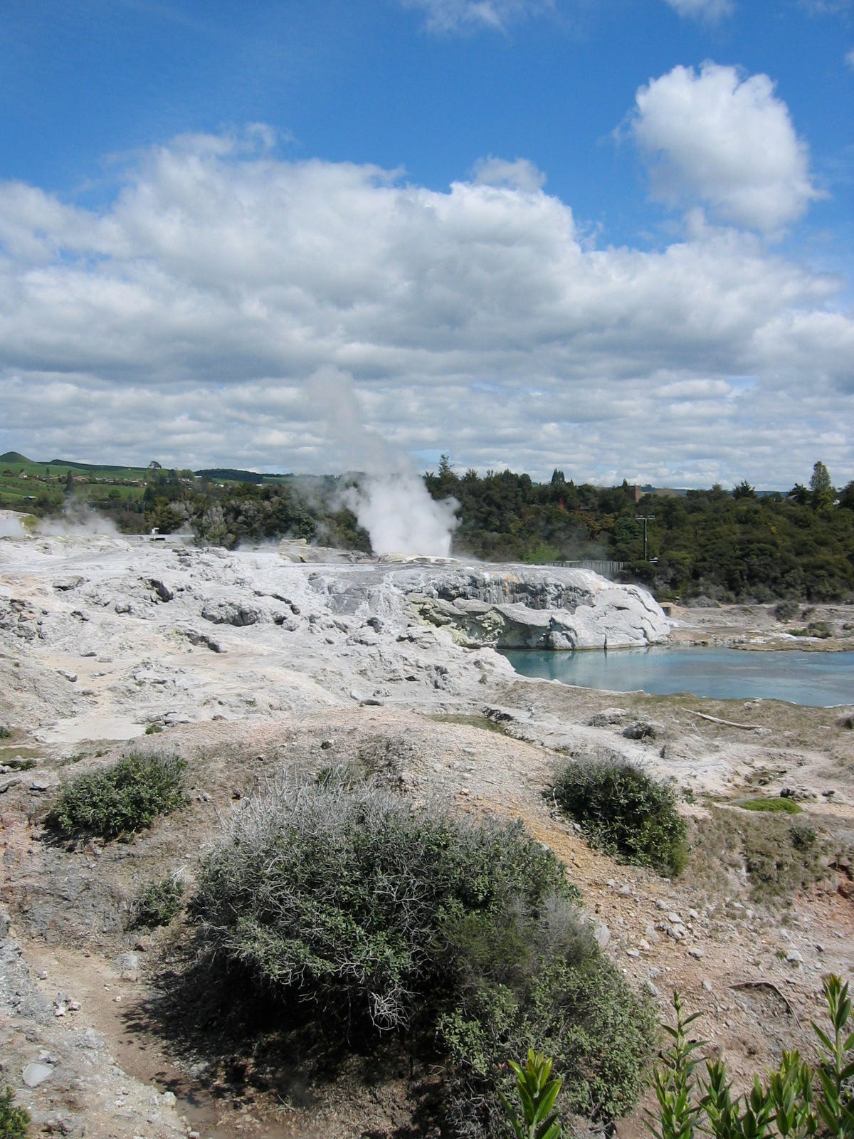 Weiter zur Südspitze der Nordinsel. Hier liegt Rotorua – eines der aktivsten geothermischen Gebiete auf der Welt. Überall steigt Dampf aus dem Boden auf, blubbern unzählige kleine Pools mit heißem Wasser vor sich hin. Die Luft ist warm, dunstig, feucht. Es riech nach einer Mischung aus Schwefel(-wasserstoff) und Silvesternacht. Ein fast surrealer Ort. Der Pohutu Geysir mitten im Stadtzentrum bricht zwanzig Mal am Tag aus – die Fontäne reicht bis zu 30 Meter in die Höhe. Zurücktreten, bitte!