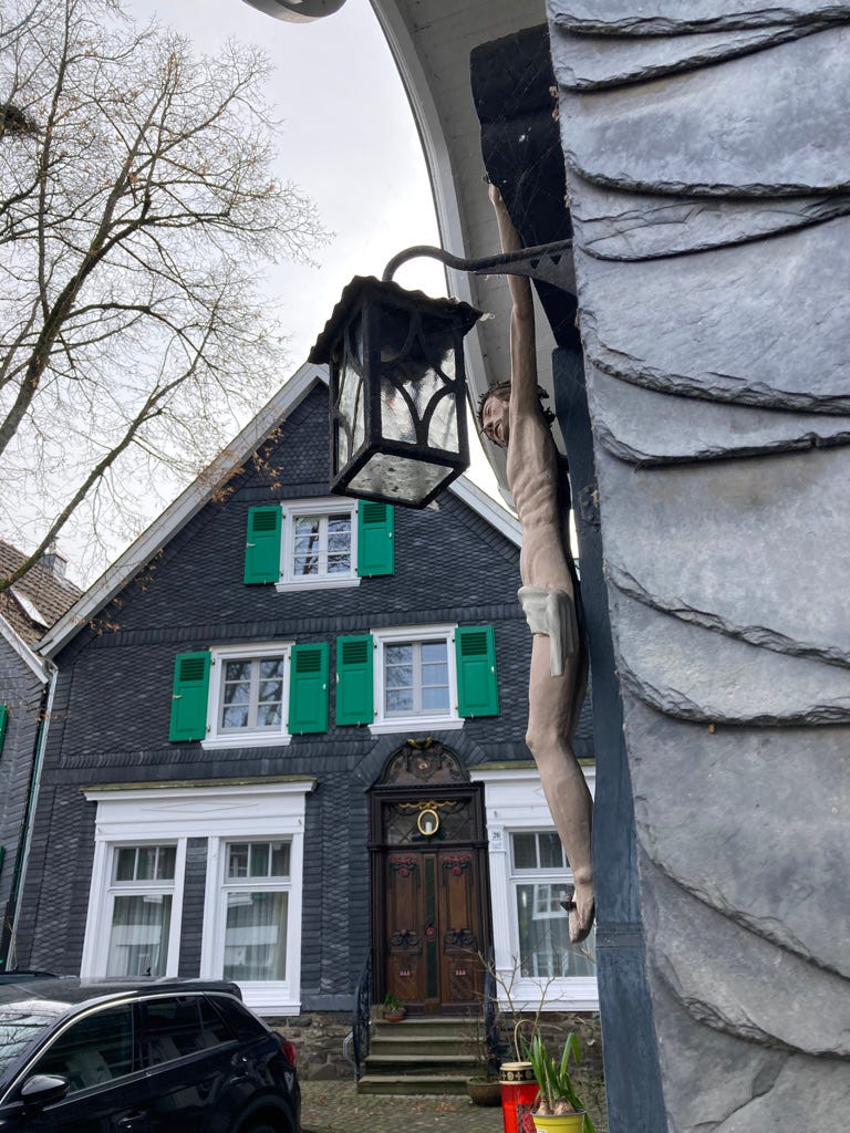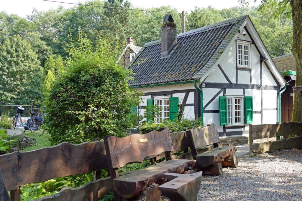 Dann hat Jochen noch einen Tipp bekommen: Wuppertal-Beyenburg. Eine etwa zwanzigminütige Autofahrt vom Zentrum entfernt warten Fachwerkhäuser der besonderen Art. Von anderen, gemeinhin bekannten Fachwerkbauten unterscheiden sich die Häuser hier in Ihrer Farbigkeit. Statt nur Schwarz bzw. Dunkelbraun auf Weiß, findet sich hier der sogenannte „Bergische Dreiklang“: schwarz, weiß, grün. Ein unglaublich malerischer Anblick.