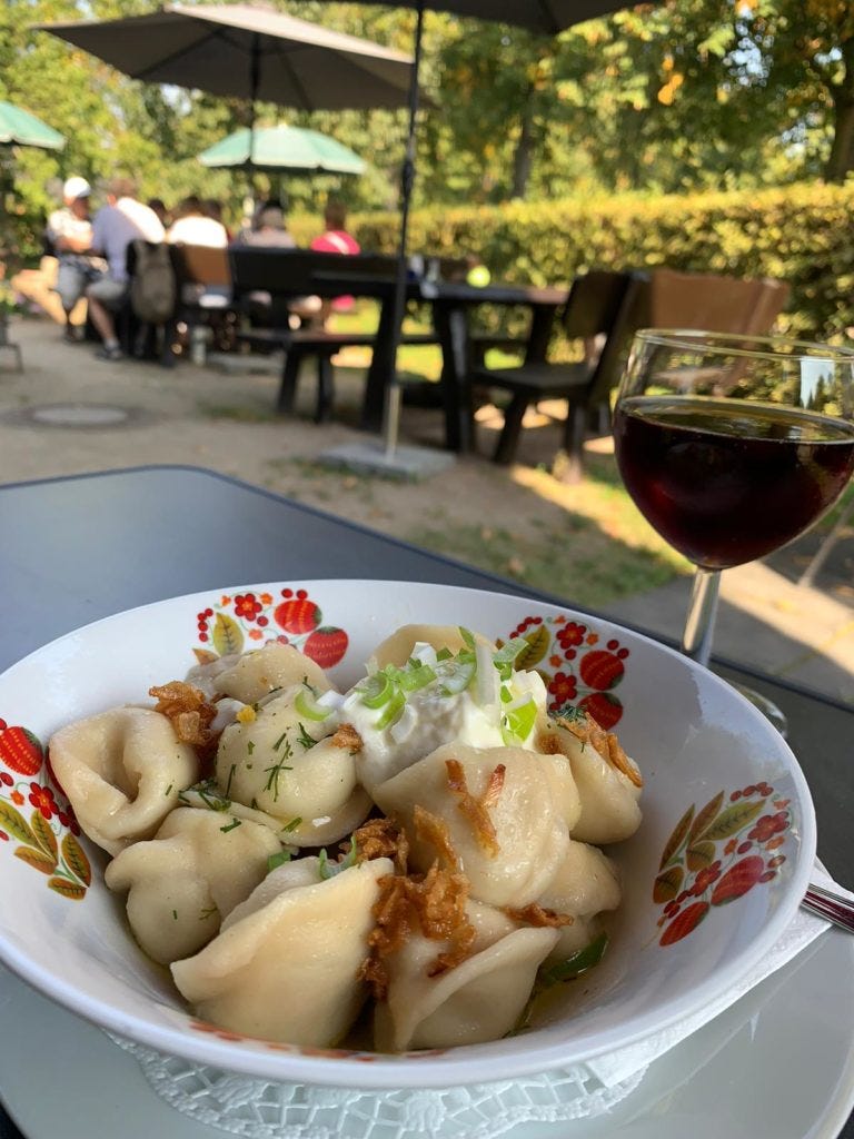 Vom Holländischen Viertel aus ging es für Michael weiter in die Russische Kolonie. Klingt nach einer recht weiten Reise? Irrtum! Mit dem Rad sind’s keine zehn Minuten bis sich diese besondere Facette – wieder mit viel Geschichte dahinter – entdekcne lässt. Wir sind also immer noch mitten in Potsdam, es fühlt sich nur nicht mehr so an, berichtet Michi…: grüne Streuobstwiesen so weit das Auge reicht, russische Holzhäuschen im „Datscha“-Stil und natürlich russisches Essen im Alexandrowka Haus1. Leichte Küche darf man natürlich nicht erwarten. Dafür ist’s umso leckerer und vor allem: richtig authentisch!