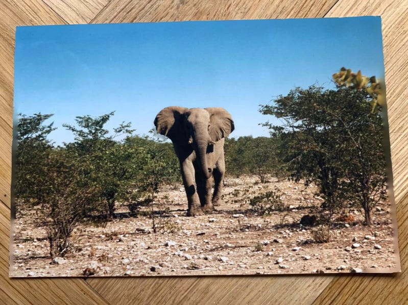 Das führte zum Einen dazu, dass die wenigen Bilder, die man gemacht hat, bis heute tatsächlich auch als solche (zum Anfassen!) existieren und darüber hinaus mit analogem Charme punkten. Wie man sich gefreut hat, wenn die Bilder nach einer Woche zuhause endlich entwickelt waren, und man beim Anschauen gedanklich nochmal ganz intensiv zurückreisen konnte … Oder, wie Michael, unter 32 nahezu identischen Bildern eines Elefanten auf ein einziges Gutes gehofft hat.