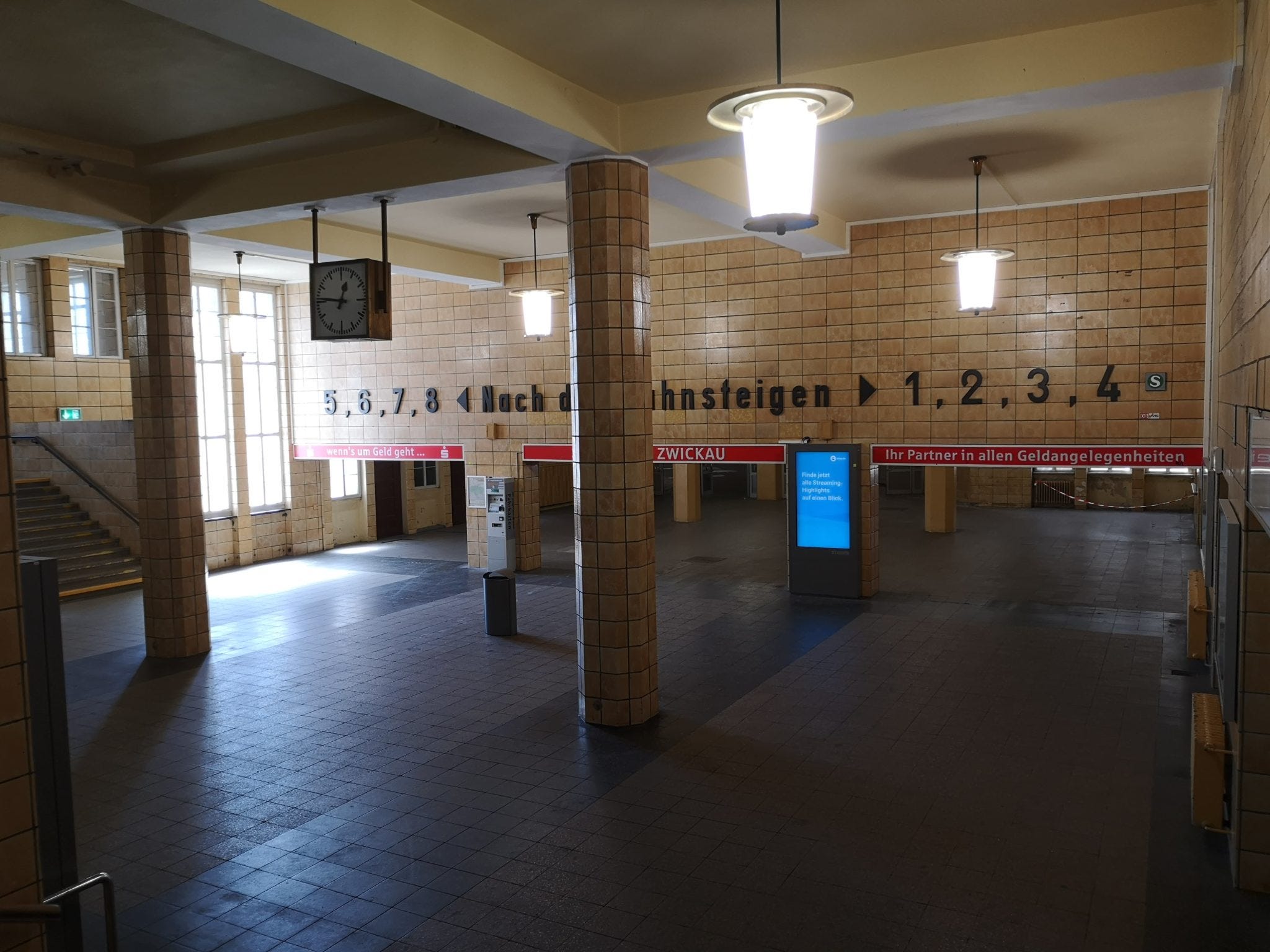 Mit einem Blick in das Empfangsgebäude des Hauptbahnhofs Zwickau verabschieden wir uns langsam aus der Stadt. Die überdimensioniert wirkende Wartehalle aus den 1930er Jahren ist ein Tor in die Vergangenheit.