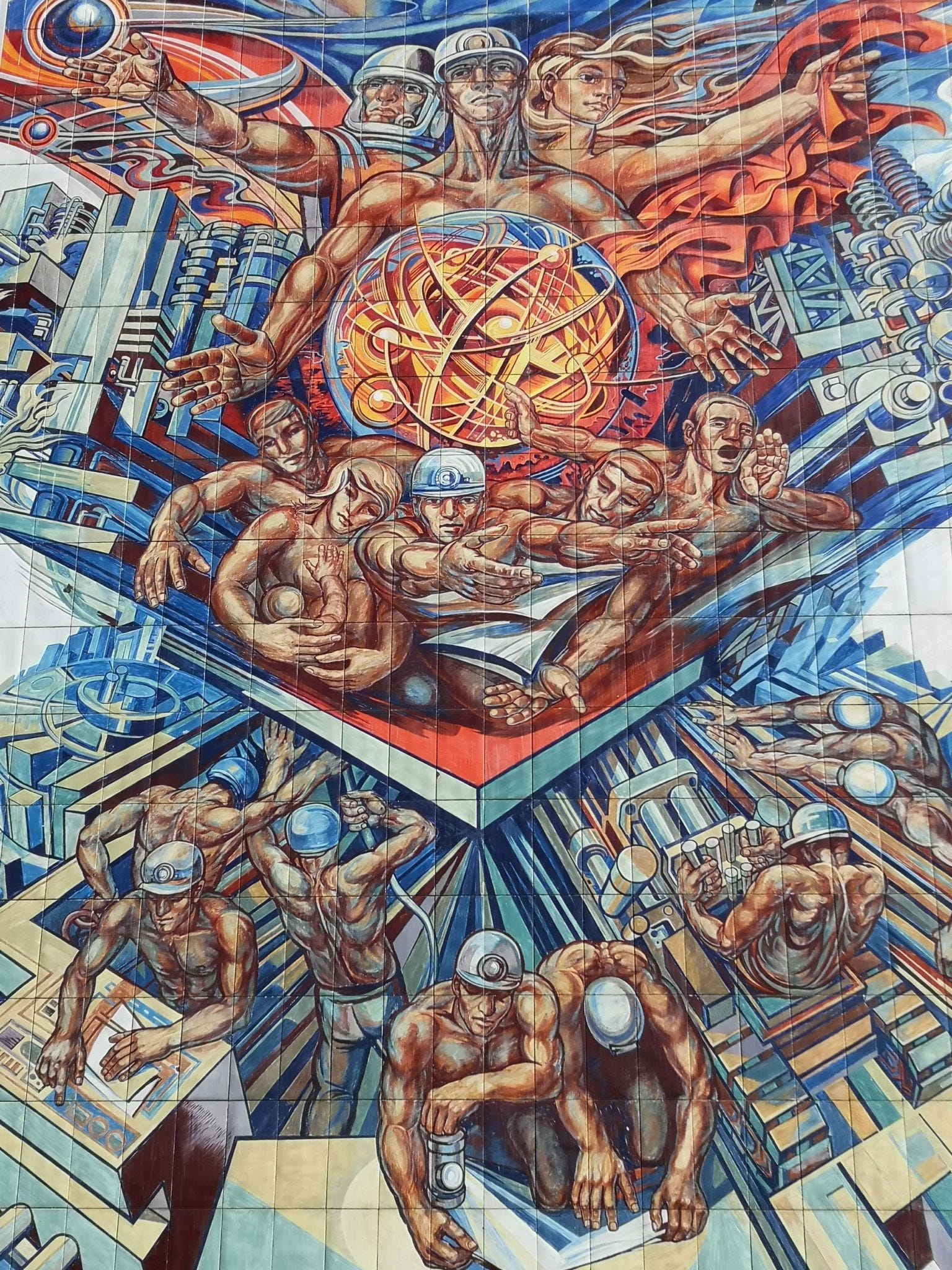 Fantasie allein wird kaum ausreichen, um sich die einstigen Mondlanschaften vorzustellen. Zum Glück gibt es die Bildersuche im Internet und einige Schautafeln am Wegesrand. Von den noch vorhandenen Relikten ist uns eines besonders in Erinnerung geblieben: Unweit eines alten Förderturms steht mitten in der Landschaft ein riesiges Bild im Stile des Sozialistischen Realismus mit dem Namen: Die friedliche Nutzung der Atomkraft (Werner Petzold, 1972-74).