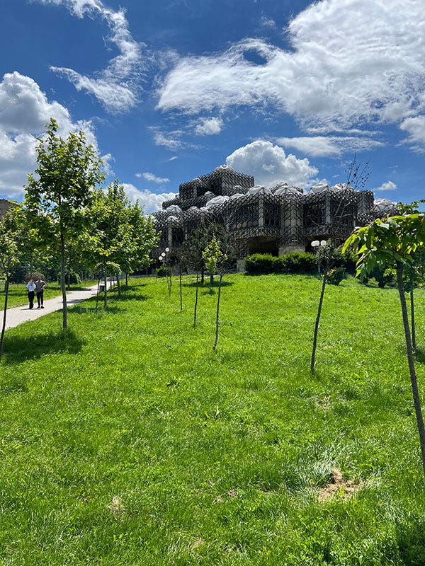 In Pristina ist alles „neu“ – das Stadtbild wird beherrscht von großen Boulevards, Sixties-Chic und Brutalismus-Architektur. Ein Paradebeispiel dafür ist die Nationalbibliothek, ein von außen eigentümlich wirkendes Gebäude, das von innen lichtdurchflutet ist und zur Universität gehört.