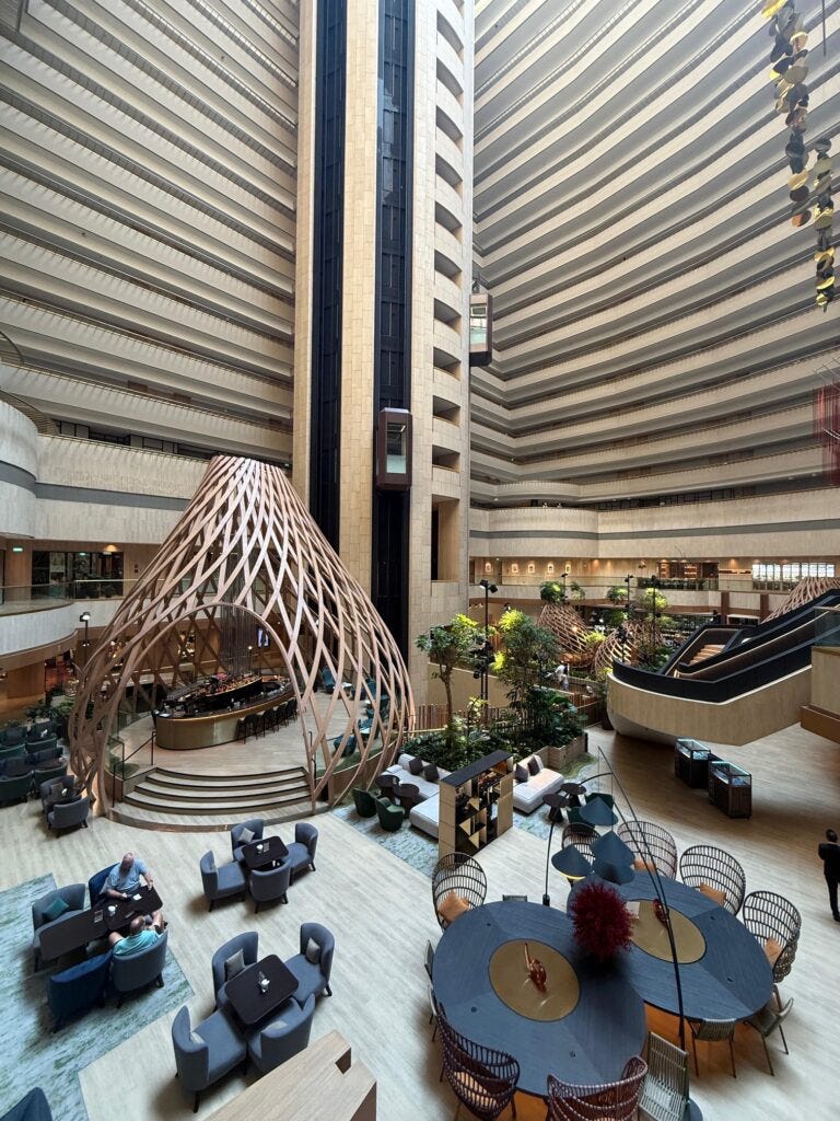 Aufzüge gleiten wie in einem Science-Fiction-Film zwischen begrünten Ebenen. Unten eine Bar in Form eines riesigen, geflochtenen Zeltes. Oben Zimmer, die auf die grüne Kathedrale blicken. Das Frühstück ist eine Weltreise: Aalsuppe, japanische Onigiri, zehn verschiedene Tofu-Sorten, westliche Klassiker, süße Kleinigkeiten aus allen Himmelsrichtungen.