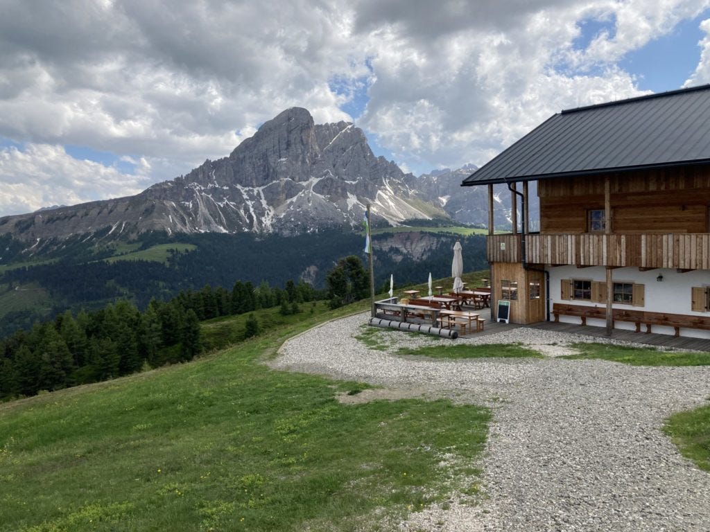 Tag zwei führte Jochen mitunter am Fuße des Peitlerkofels entlang, bis es irgendwann natürlich wieder hoch, also… noch höher hinauf ging. Die Bleibe für die zweite Nacht: die Schlüterhütte. Aber vor der Nachtruhe wurde natürlich wieder vom Feinsten schnabuliert. Außerdem lernt Jochen Günther kennen, einen Südtiroler wie man ihn sich halt so vorstellt. Etwas, das den Reiz des „Hüttenwanderns“ eben auch ausmacht: Man trifft immer wieder auf spannende Menschen, mit denen man sich stundenlang verquatschen kann.