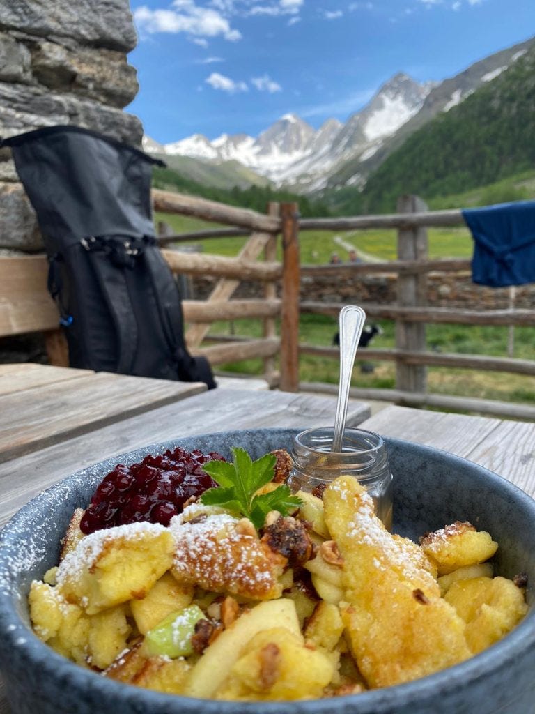 Am nächsten Tag ging es mit der Texelbahn rauf zum Giggelberg. Klingt nicht nur spaßig, war’s auch. Und es konnten natürlich die ersten wunderschönen Ausblicke bestaunt werden. Um daran würdig anzuschließen, ging es für Michi weiter zur 1000-Stufen-Schlucht, vorbei an Wasserfällen und über eine spektakuläre Hängebrücke. Im Anschluss gab’s dann erstmal eine ordentliche Stärkung im rustikalen Pirchhof: Traditionelle Knödel und Kaiserschmarrn! Gut gestärkt ging die Wanderung weiter nach Katharinaberg im Schnalstal, zum Montferthof, ein Biohof, der Wandersleute mit hofeigenen Köstlichkeiten verwöhnt und eine Bett für die Nacht bietet, das Michael dankend genutzt hat.