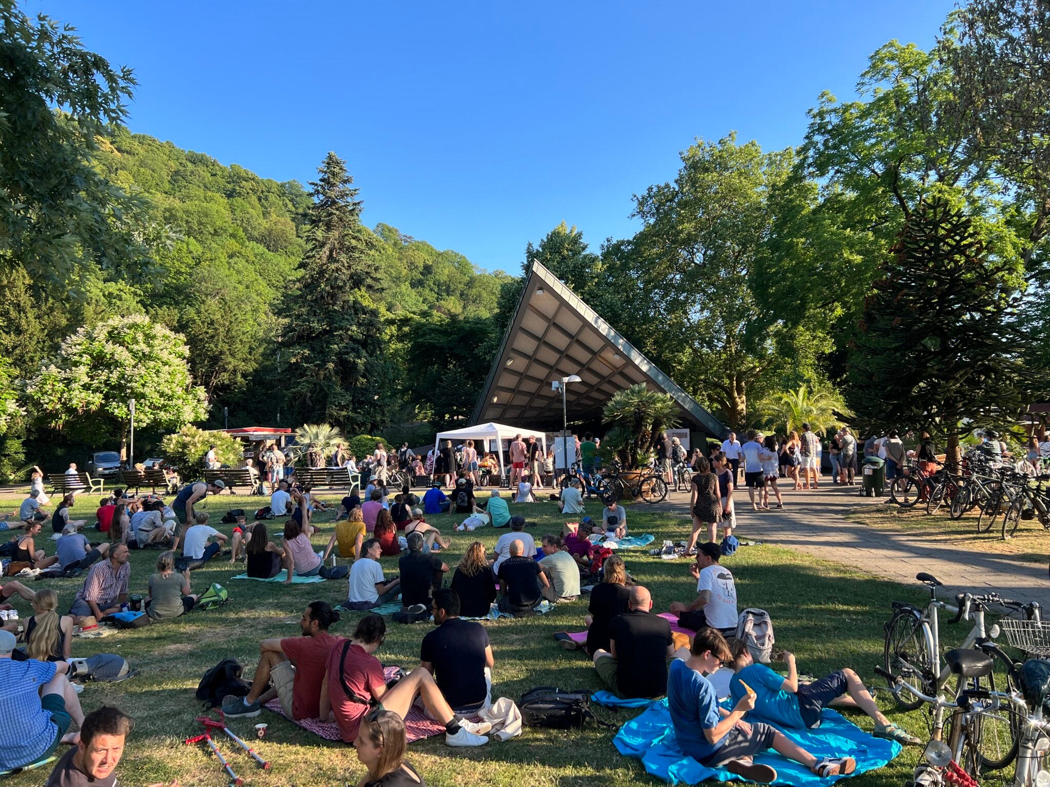 Wieder zurück in urbaneren Gefilden ist Michael am Stadtgarten vorbeigekommen. Auch dort gab es – neben vielen, schönen Grünflächen zum Relaxen – zufällig gerade Musik auf die Ohren, statt Jazz nun eine Art Synth-Rock im Stile der 70er. Vom Stadtgarten aus fährt die Schlossberg-Bahn auf den gleichnamigen Berg. Die wollte Michael eigentlich nehmen, hat sich dann aber doch für eine weitere kleine Wanderung entschieden. Pünktlich zum Sonnenuntergang saß er dann auf im Kastaniengarten mit tollem Blick über Freiburg im Abendrot.