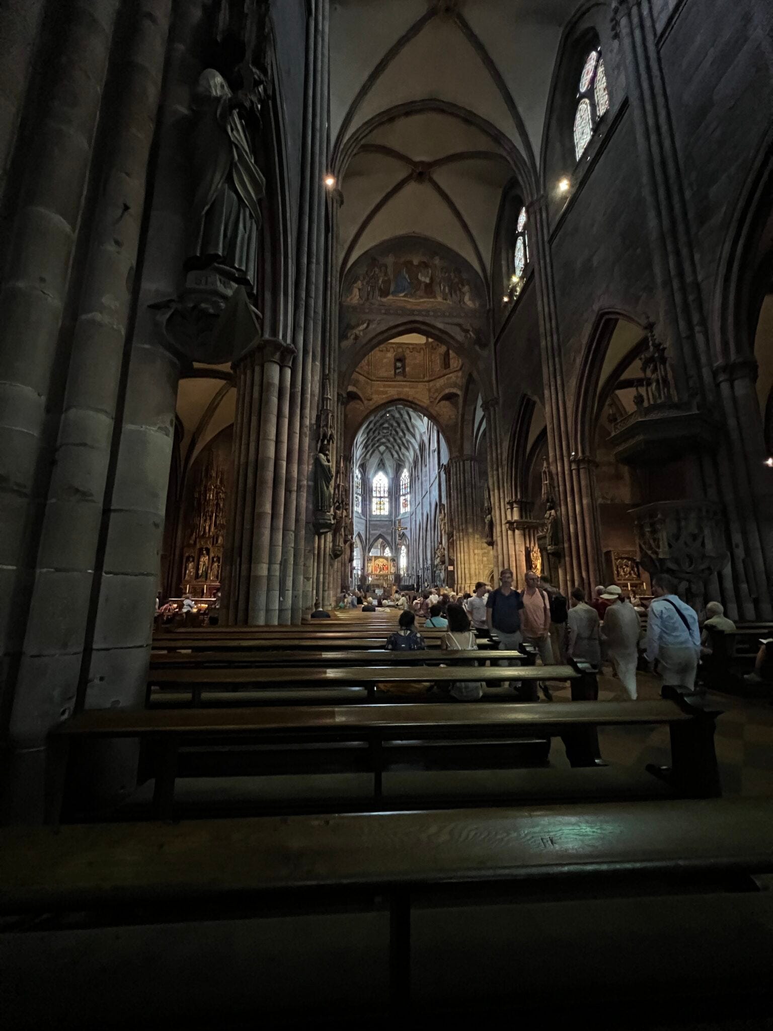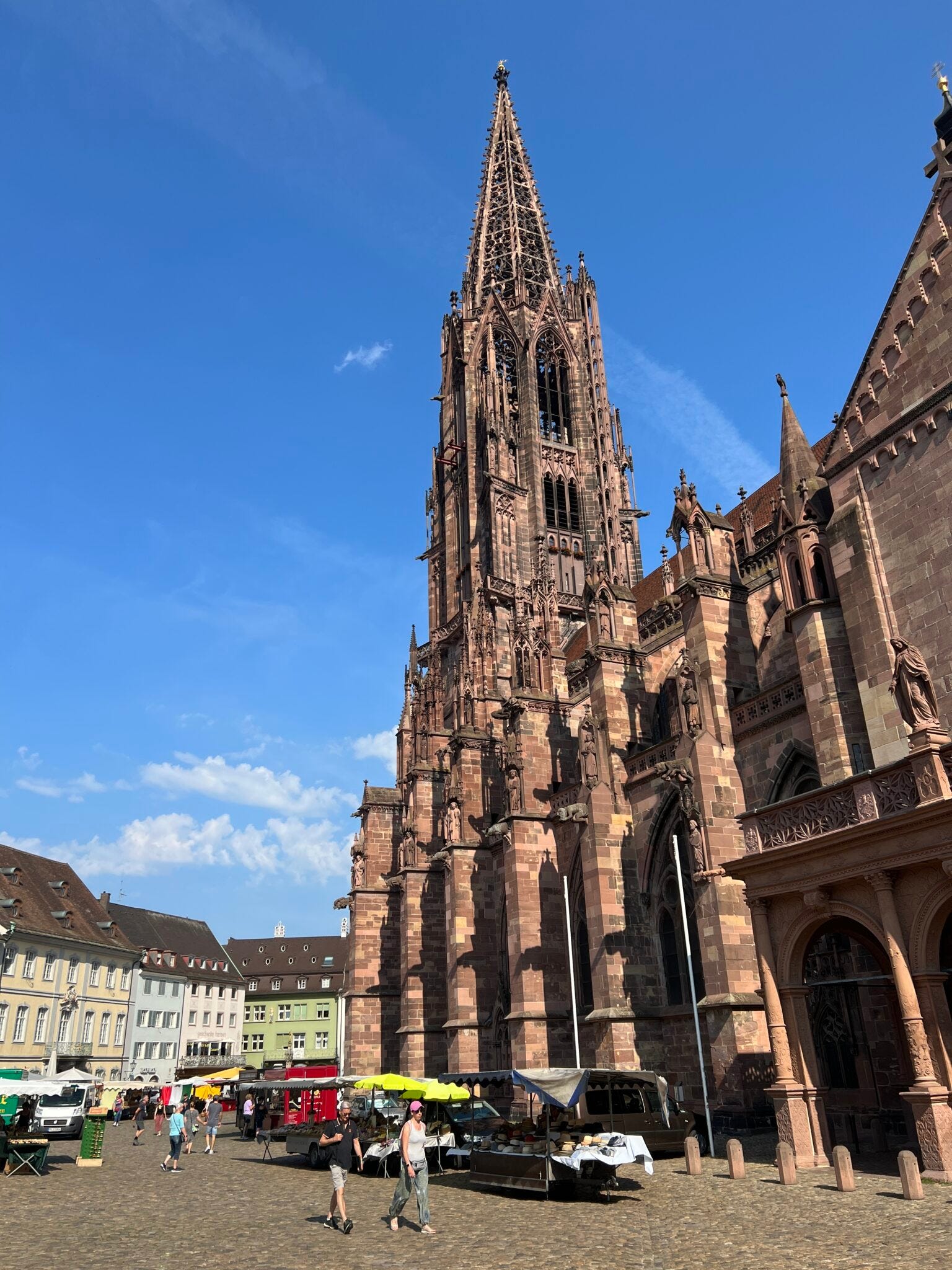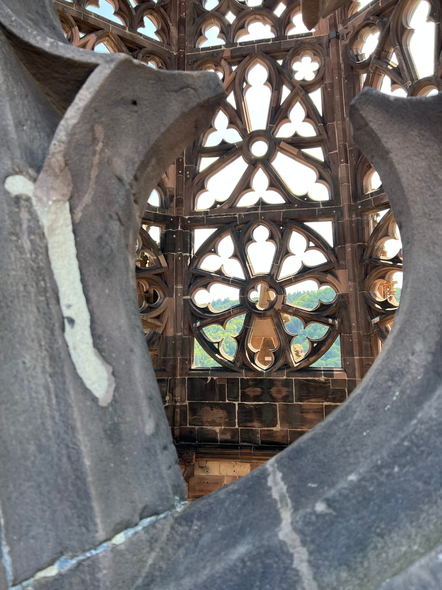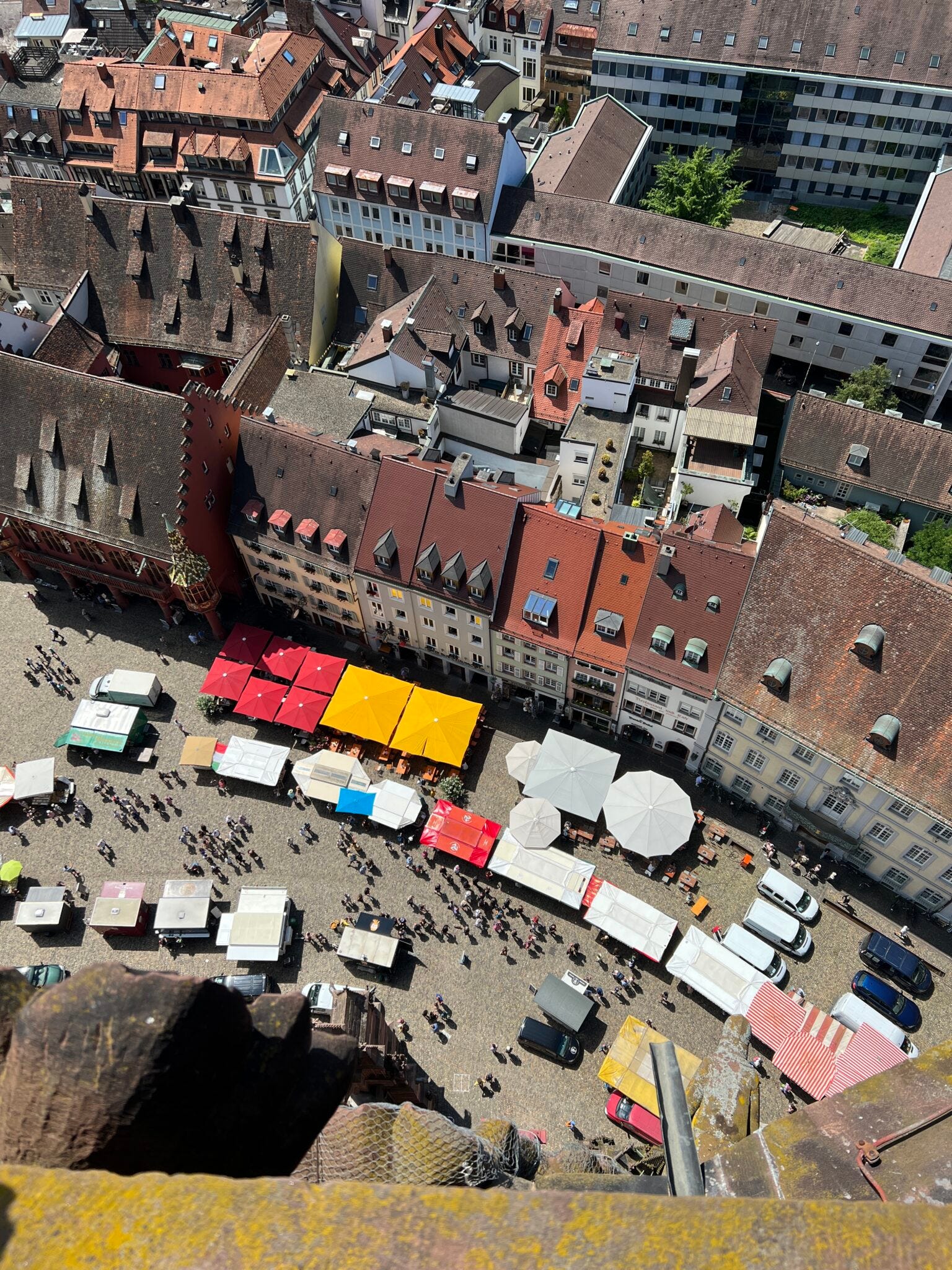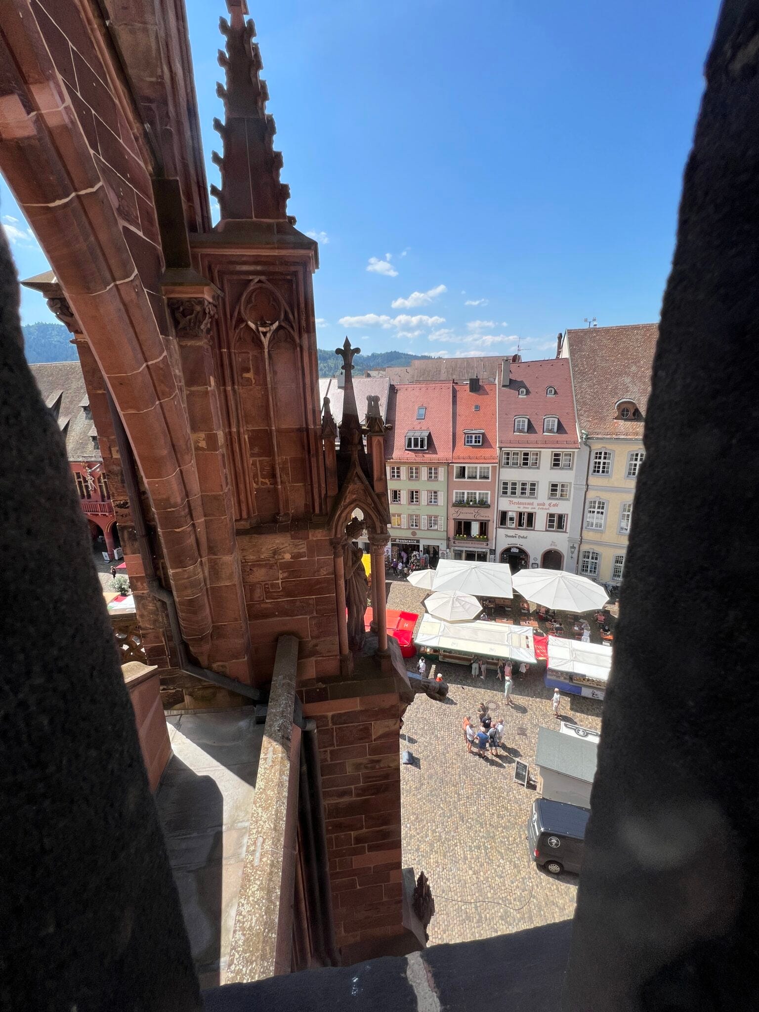 Um die ganze angefutterte Energie wieder loszuwerden, hieß es im Anschluss: Rein ins und rauf aufs Freiburger Münster! 116 Meter misst sein Turm. Erbaut wurde das Münster von 1200 bis 1513. Die Belohnung nach etlichen Treppenstufen in schmalen Gängen: ein Rundum-Blick über die Stadt.