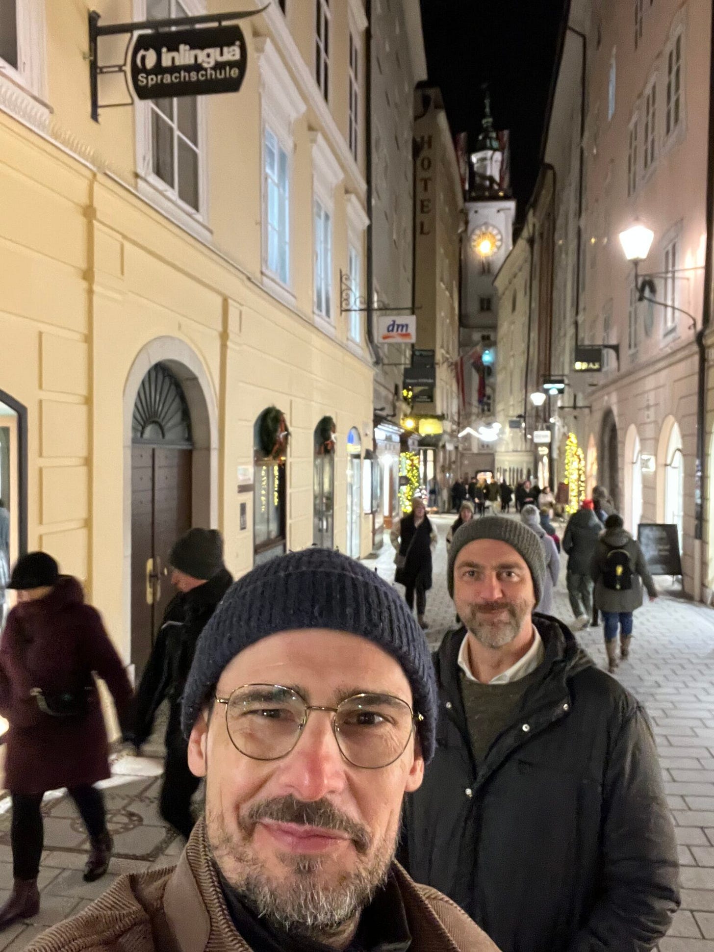 Raus aus’m Dom, rein ins Gewimmel. Jochen und Michael haben ihre Zeit in Salzburg auch genutzt, um dem Endjahrestrubel zu entfliehen, in dem man sich zuhause ja doch irgendwie alle Jahre wieder verstrickt findet, sodass einem die letzten Wochen des Jahres dann manchmal eher besinnungslos statt besinnlich vorkommen. Hier in Salzburg hieß es: einfach runterkommen, genießen, treiben lassen und dabei schonmal das ein oder andere Weihnachtsgeschenk einsacken.